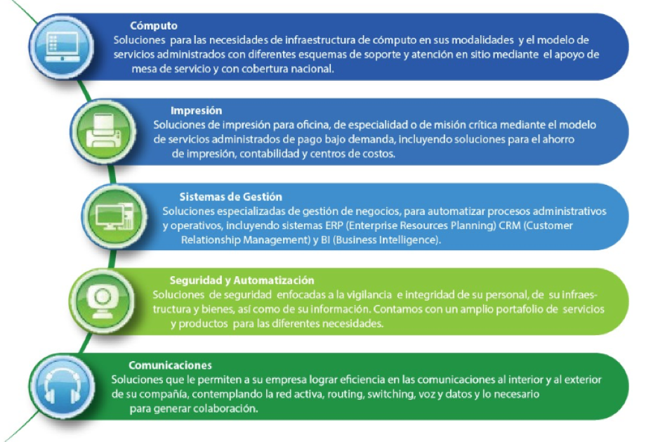 El modelo de Servicios Administrados pueden ayudarlo a administrar el ambiente de su infraestructura con mayor eficiencia y agilidad. Nuestro portafolio de Soluciones para estas tareas son una forma estable y segura de administrar todos los componentes de su infraestructura, incluyendo computadoras personales, servidores, centros de impresión, periféricos, accesorios y red de datos.