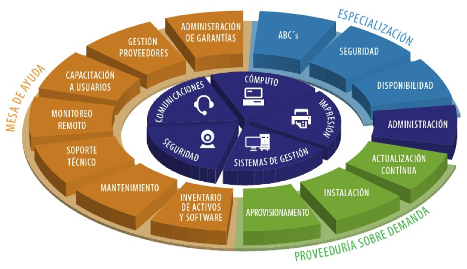 Aprovisionamiento de infraestructura de TI, en conjunto con soluciones especializadas de software y servicios profesionales de consultoría para su implementación, administración, soporte y mantenimiento bajo un esquema de servicios mediante pagos mensuales como costo operativo, sin inversión en activos y evitando obsolescencia tecnológica.